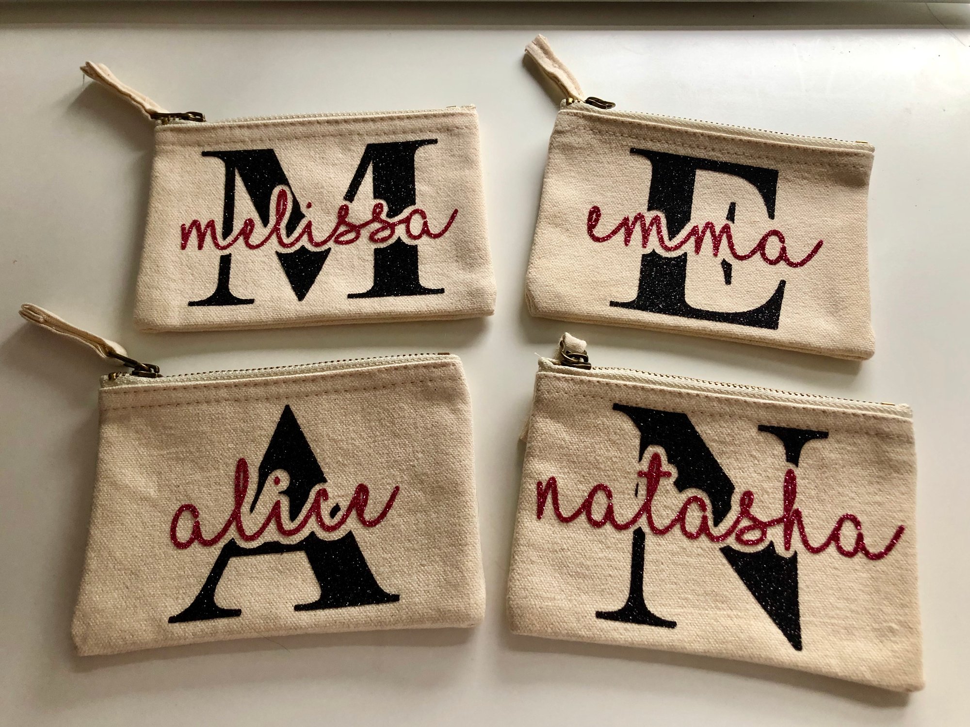 These lovely little coin purses are personalised with the initial and name of your choice in glitter vinyl, and an additional message can be added to the reverse for £1.50 to make it really personal.