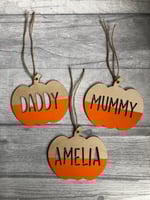 Hand painted personalised pumpkin decorations. Can be personalised with a name or phrase of your choice up to 15 characters.