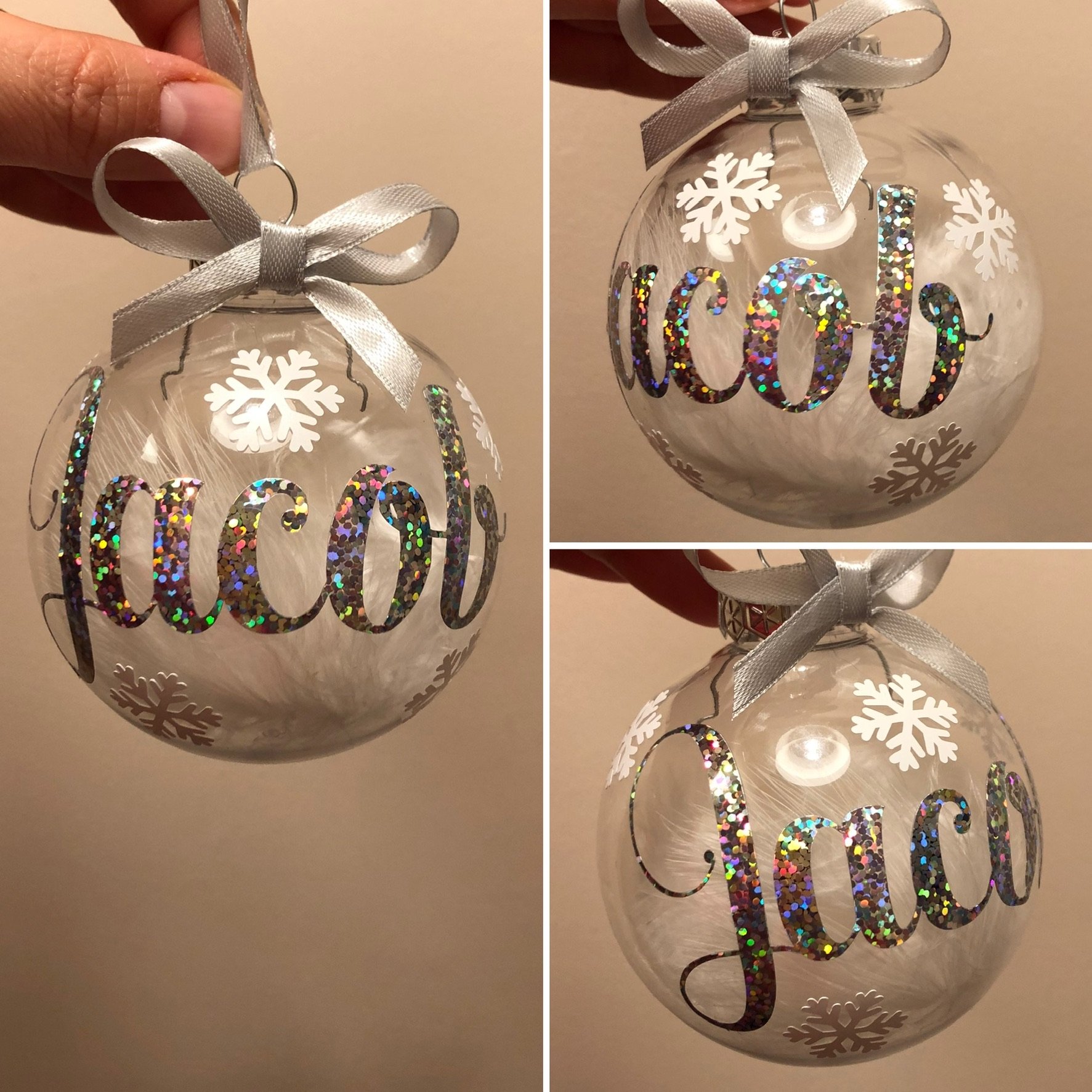 These Christmas baubles can be personalised with one name (first or surname), plus a message (if desired) and some additional decorations such as snowflakes or stars in a complimentary colour. Each bauble will be finished with a matching ribbon and bow. Baubles will have some snow or feathers inside.